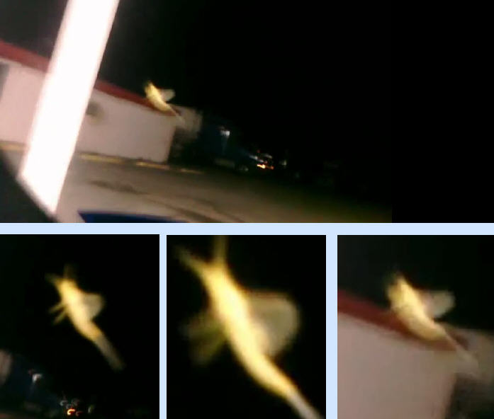 In Tennessee sitzt ein Pärchen im Auto auf einem Parkplatz und filmt aus der Frontscheibe hinaus, wo es dieses merkwürdige Wesen vor die Kamera bekommt. Auf den ersten Blick sieht es wie ein Insekt (z. B. eine Heuschrecke) aus, doch die Flugeigenschaften (die "Flügel" scheinen sich nicht zu bewegen), machen ein uns bekanntes Insekt eher unwahrscheinlich. Ich will aber offen lassen, ob es sich dabei um ein Naturwesen (ein Wesen aus der Feenwelt) handelt.