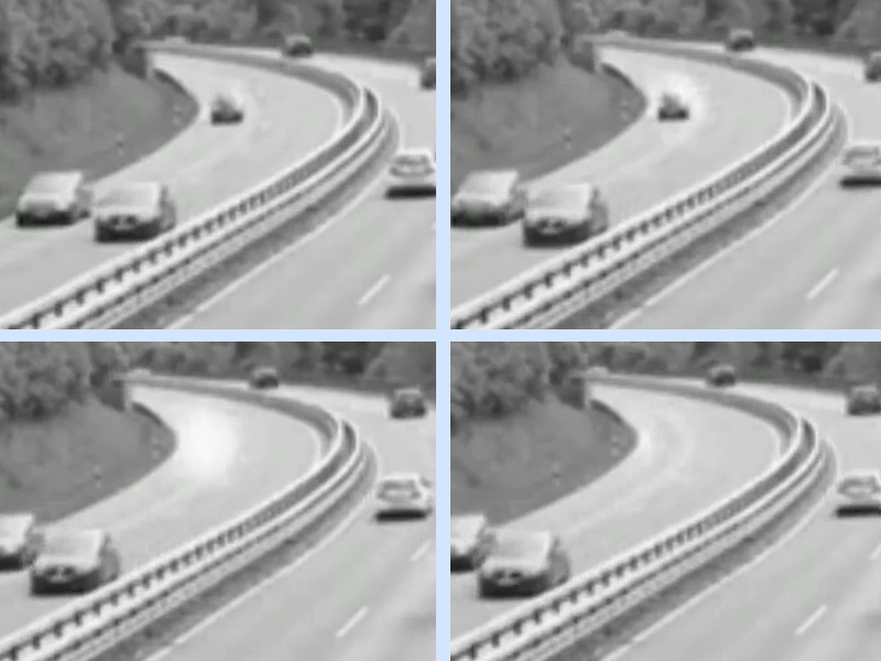 Auf einer Autobahn oder Schnellstraße verschwindet ein ansonsten unauffälliger PKW urplötzlich von der Bildfläche. Beim zweiten Videoschnappschuss ist ganz kurz noch das beginnende Licht zu erkennen, beim dritten Schnappschuss überstrahlt das Licht schon den ganzen Autobereich.