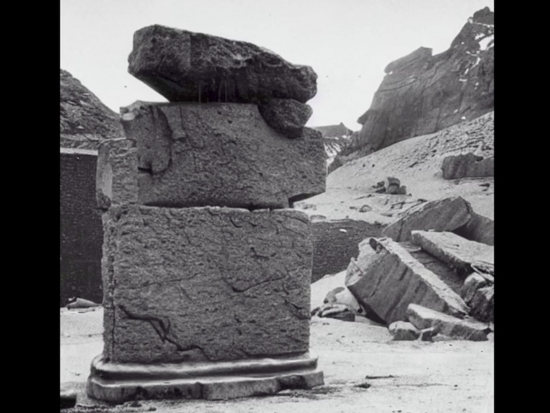 Vor einer Ruine ist die Skulptur eines Pinguin. Ich habe dieses Bild an die erste Stelle gesetzt, damit wir akzeptieren, dass es sich um Aufnahmen der südlichen (und nicht der nördlichen Polarregionen) handelt. Damit ist keineswegs bewiesen, dass es sich um die Antarktis handelt, denn Pinguine haben ihre Brutkolonien auch auf zahlreichen Inseln südlich des Äquators.